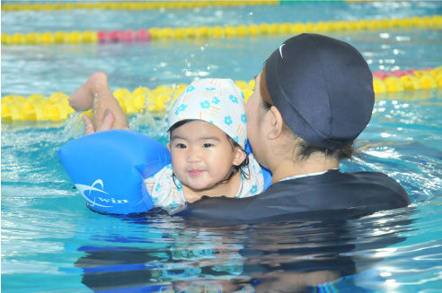 | 6ヶ月〜3才未満の幼児とお母さんが楽しいゲームをしながら水なれをしていくベビーコース。 水に対す恐怖心をなくし体をじょうぶにします。水の中では母と子の絆がいっそう確かなものになります。 |